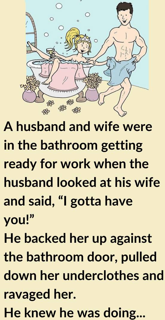A husband and wife were in the bathroom getting ready for work when the husband looked at his wife and said, “I gotta have you!”He backed her up against the bathroom door, pulled down her underclothes and ravaged her.