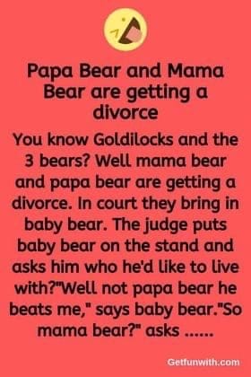 Papa Bear and Mama Bear are getting a divorce.You know Goldilocks and the 3 bears? Well mama bear and papa bear are getting a divorce.In court they bring in baby bear. The judge puts baby bear on the stand and asks him who he’d like to live with?“