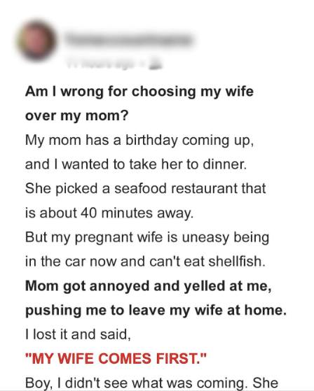 In a family quarrel, a man felt compelled to support his wife’s position. However, his mother became unhappy with him for doing so, so he resorted to the internet to see if he was correct.
