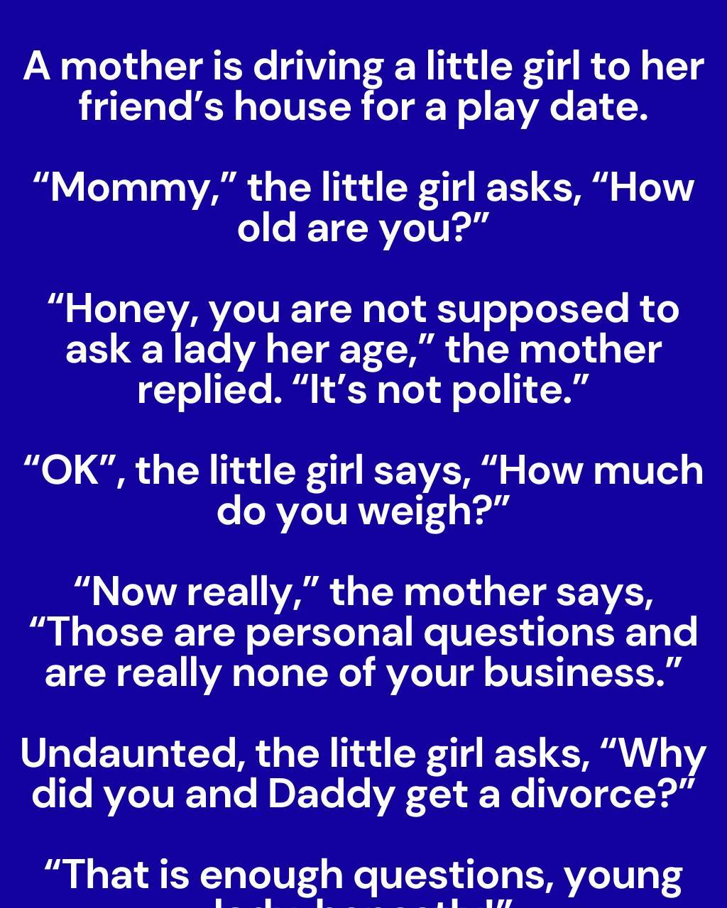 A mother was driving a little girl to her friend’s house for a play date… “Mommy?” the little girl asked, “How old are you?” “Honey, you are not supposed to ask a lady her age,” the mother replied, “It’s not polite.