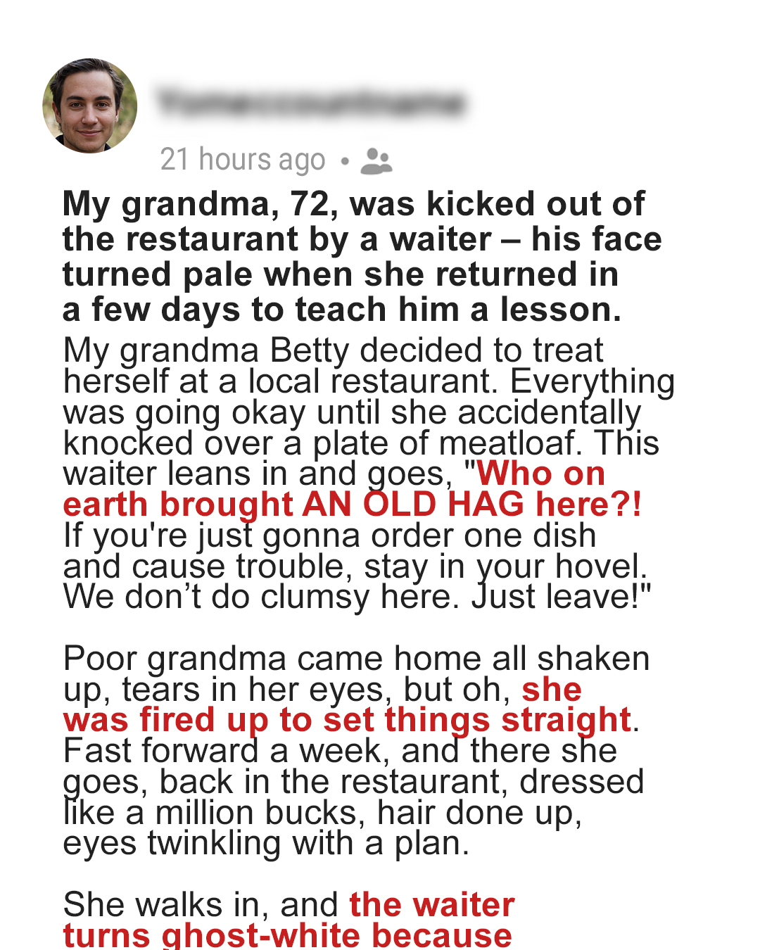 When Nate’s grandparents want to celebrate their anniversary with a fancy dinner at a local restaurant, his grandmother goes in to choose which items she’d like from the table. But one thing leads to another when she knocks over a plate — causing her to be kicked out. But Nate plots his revenge.It was supposed to be a simple visit — a grandmother checking on the quality of meals at a local restaurant for her upcoming 50th wedding anniversary dinner with her husband and their immediate family.Yet, what unfolded for my grandmother was nothing short of disrespectful and heartbreaking.