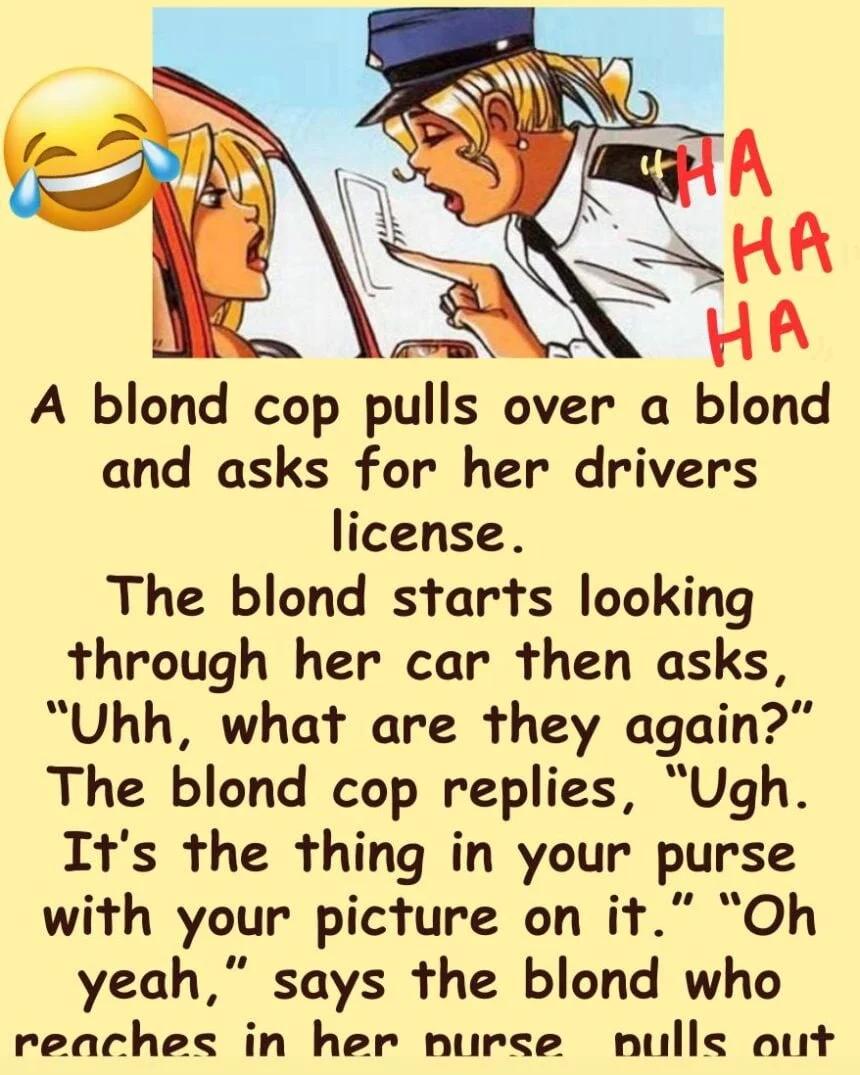 A blond cop pulls over a blond and asks for her drivers license. The blond starts looking through her car then asks, “Uhh, what are they again?” The blond cop replies, “Ugh. It’s the thing in your purse with your picture on it.” “Oh yeah,” says the blond who reaches in her purse, pulls out a compact mirror, and hands it over.