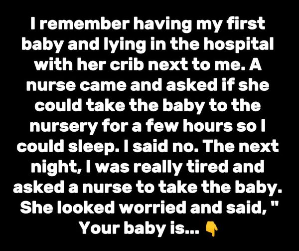 The next night, I was really tired and asked a nurse if she could take the baby to the nursery for a few hours. The nurse looked shocked and said, “Your baby is supposed to stay with you in this room. We don’t have a nursery. No one would ever take your baby from you!