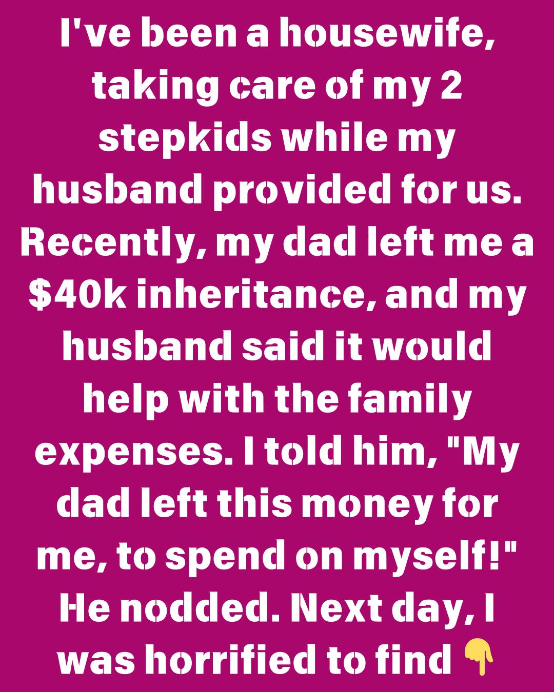 I’ve been a housewife, taking care of my 2 stepkids while my husband provided for us. Recently, my dad left me a $40k inheritance, and my husband said it would help with the family expenses. I told him, “My dad left this money for me, to spend on myself!”
