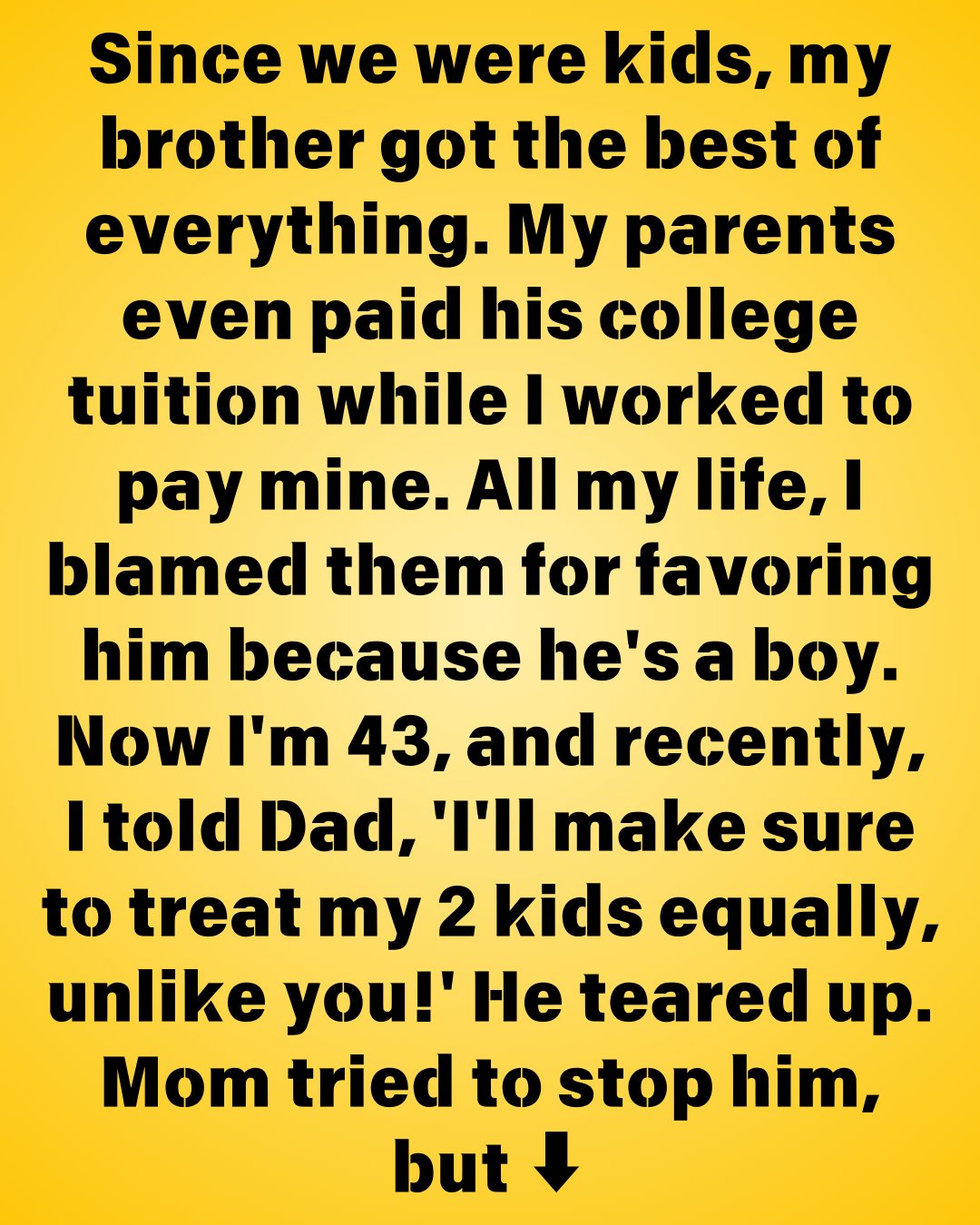 Since we were kids, my brother got the best of everything. My parents even paid his college tuition while I worked to pay mine. All my life, I blamed them for favoring him because he’s a boy.