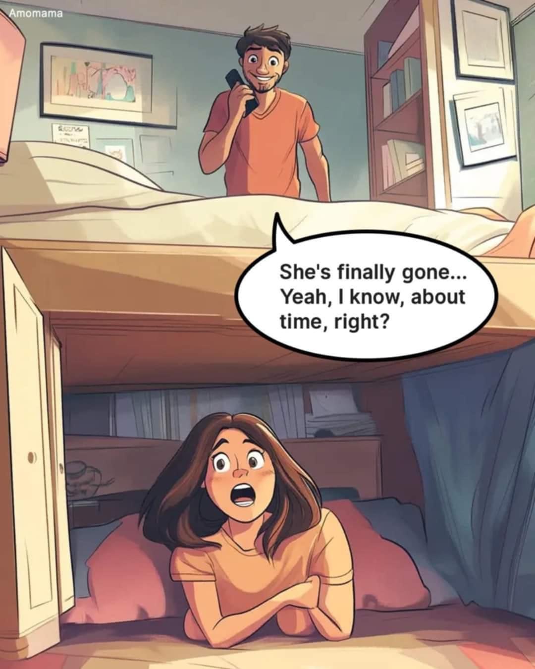 Then she hid under the bed to see his reaction.