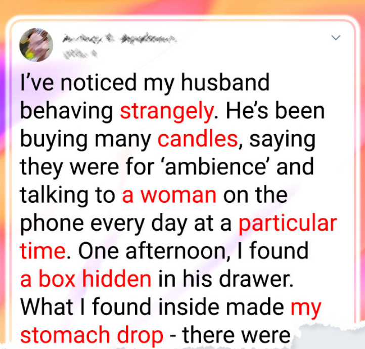 Recently we received a gripping story from a young woman whose life took an unsettling turn after she discovered something hidden in her husband’s drawer. His strange new habits, odd behavior, and mysterious phone calls were already raising red flags. But when she uncovered a locked box filled with cryptic and eerie items, her unease turned to fear.
