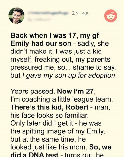 At 17, the idea of being parents was overwhelming. Our parents were against abortion, so Emily carried the pregnancy to term, tragically losing her life during childbirth. Her parents, consumed by grief, wanted nothing to do with the baby, and my parents, seeing the toll it took on me, pushed for adoption. Despite the deep conflict within me, knowing Emily had given her life for our son, and my love for him, I ultimately succumbed to the pressures of my situation and my lack of resources, making the excruciating decision to give him up. The guilt of that decision haunted me, perhaps driving my passion for coaching, and being around kids the same age as my son would have been.The thought that Robert could be my son seemed far-fetched, as it was based merely on a slight resemblance and shared interests.