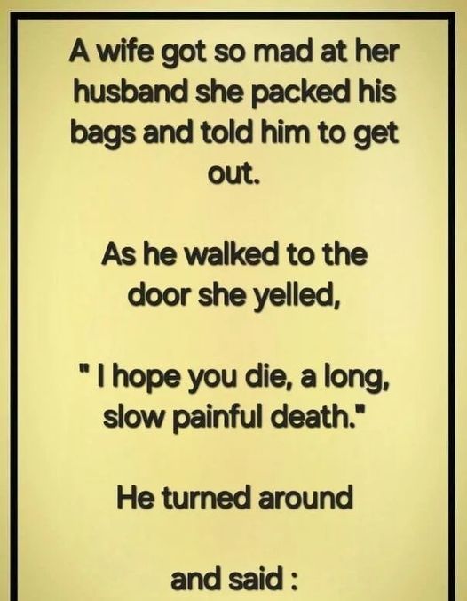 As he walked to the door she yelled, ” I hope you die, a long, slow painful death.” He turned around and said : ‘So, you, want me to fukig stay?