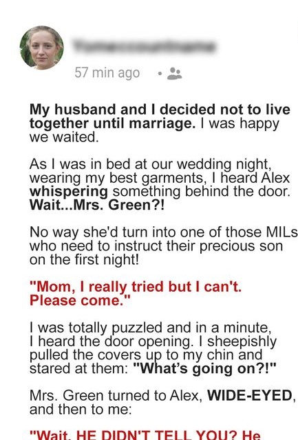 As I waited in bed, wearing my best garments, I heard him whispering something to his mom behind the door. Mrs. Green? What was she doing here? No way she would turn into one of those mothers-in-law, who need to instruct their precious son on the first night! Or worse, could she be here to instruct me?