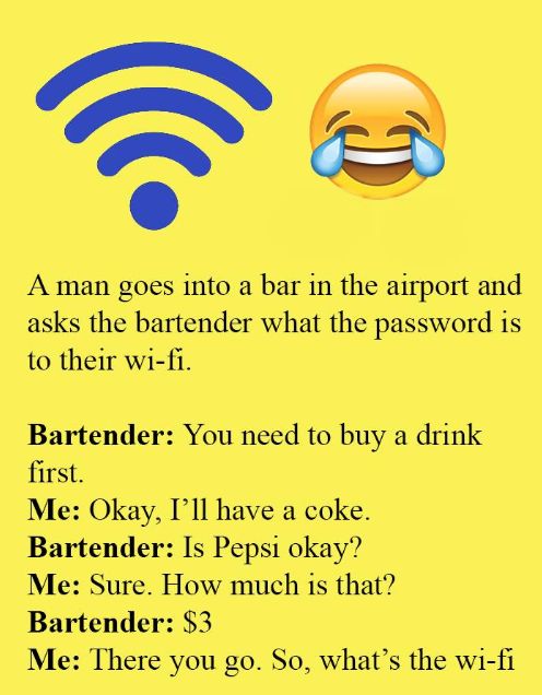 A man goes into a bar in the airport and asks the bartender what the password is to their wi-fi.