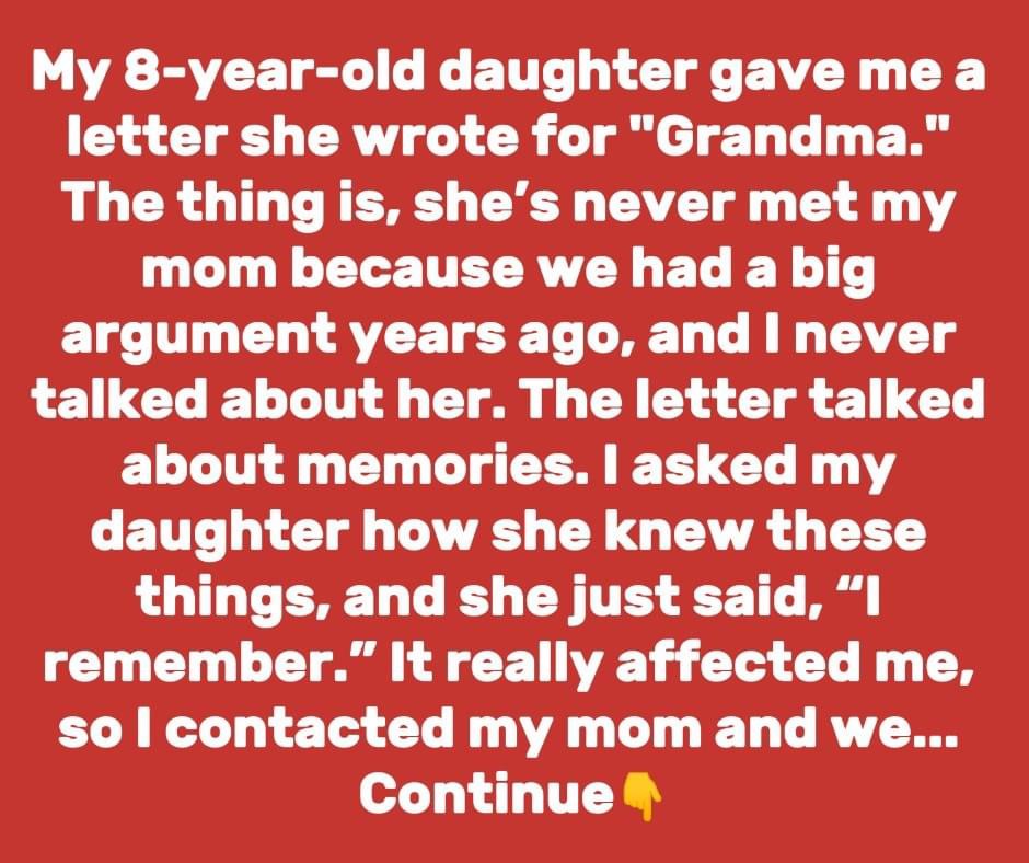 My 8-year-old daughter gave me a letter she wrote for “Grandma.” The thing is, she’s never met my mom because we had a big fight years ago, and I never talked about her. The letter described memories I had forgotten—like picnics at the park and baking cookies together. I asked my daughter how she knew these things, and she just said, “I remember.”