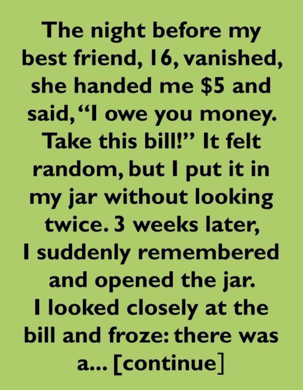 The night before my best friend, 16, vanished, she handed me $5 and said, “I owe you money. Take this bill!” It felt random, but I put it in my jar without looking twice. 3 weeks later, I suddenly remembered and opened the jar. When I examined the bill, my blood ran cold. She had marked it with a tiny handwritten message. I looked closely to read it and I froze: there was a message in blue ink that said: “No matter what happens, you will stay in my heart.”