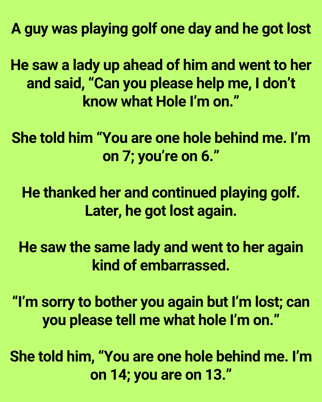 He saw a lady up ahead of him and went to her and said, “Can you please help me, I don’t know what Hole I’m on.”