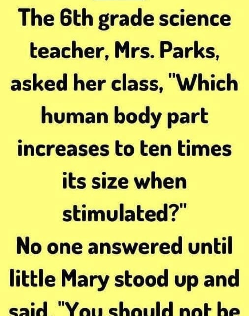No one answered until little Mary stood up and said, “You should not be asking sixth-graders a question like that! I’m going to tell my parents, and they will go and tell the principal, who will then fire you!”Mrs. Parks ignored her and asked the question again, “Which body part increases to 10 times its size when stimulated?”