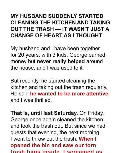 But recently, he started cleaning the kitchen and taking out the trash regularly. He said he wanted to be more attentive, and I was thrilled. That is, until last Saturday.