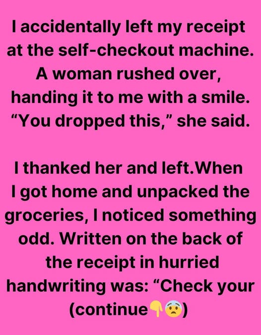 I accidentally left my receipt at the self-checkout machine. A woman rushed over, handing it to me with a smile. “You dropped this,” she said. I thanked her and left.