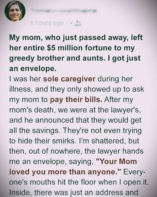The woman then remembered when the will of her mother was going to be read. In the room that looked like a scene from a Hallmark movie, her brother, her aunts, and the lawyer for her late mother were all sitting.