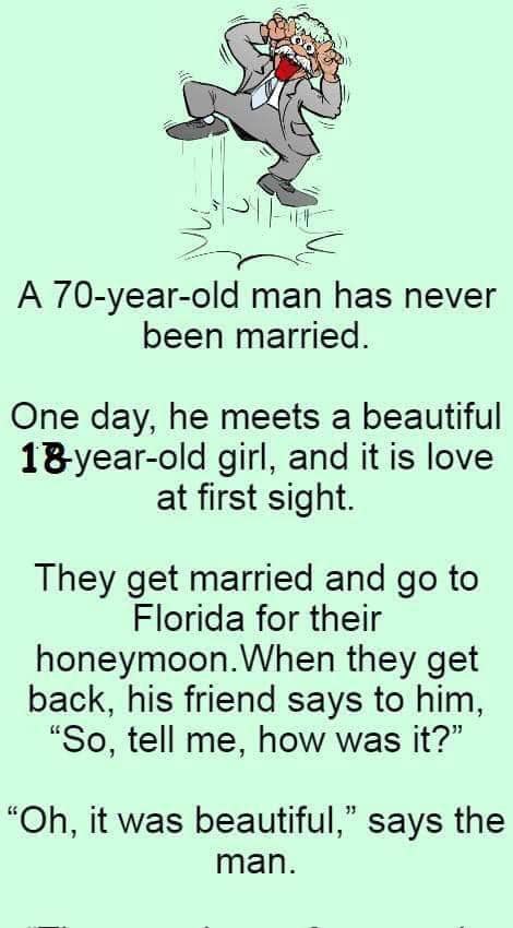 A 70-year-old man has never been married. One day, he meets a beautiful 18-year-old girl, and it is love at first sight. They get married and go to Florida for their honeymoon When they get back, tel frie, howvas him, “Oh, it was beautiful,” says the man. “
