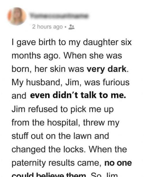 A few weeks passed by, and Jim finally agreed on a DNA test. To his surprise, it showed 100% match between him and the baby. He then took it again, but the results were the same.