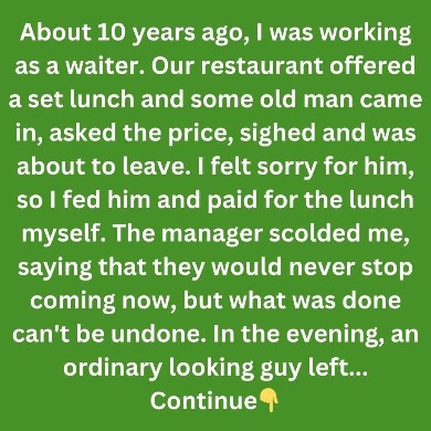 About 10 years ago, I was working as a waiter. Our restaurant offered a set lunch, and some old man came in, asked the price, sighed, and was about to leave.