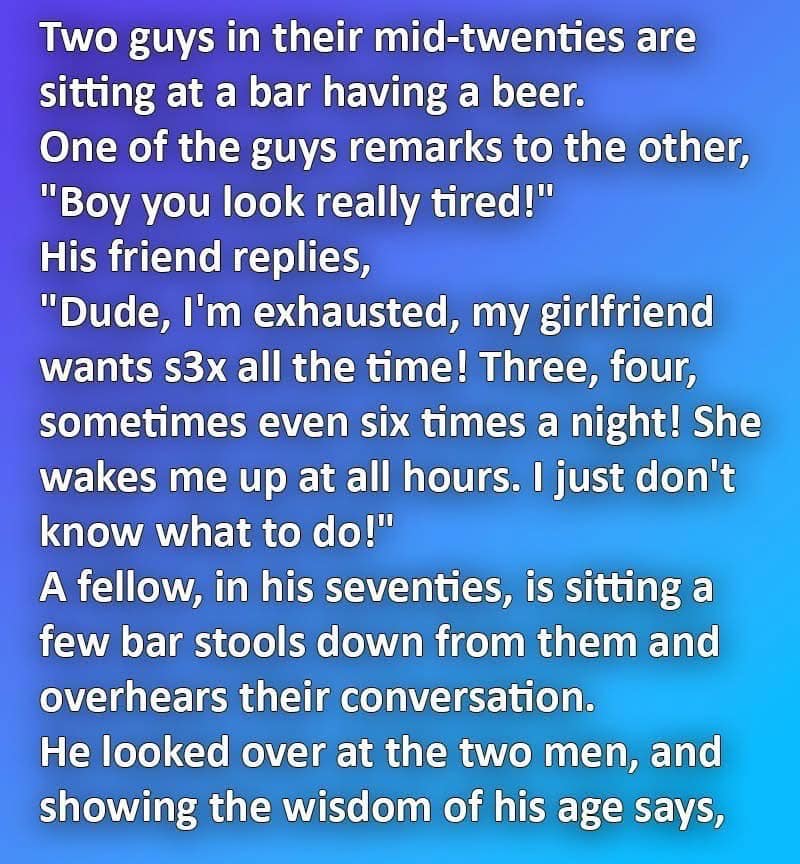 A fellow, in his seventies, is sitting a few bar stools down from them and overhears their