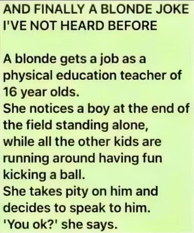 A young blonde began her new job as a physical education teacher for a class of 16-year-olds. While supervising a soccer game, she noticed one boy standing alone at the far end of the field, away from the others. Feeling concerned, she approached him with a kind smile.