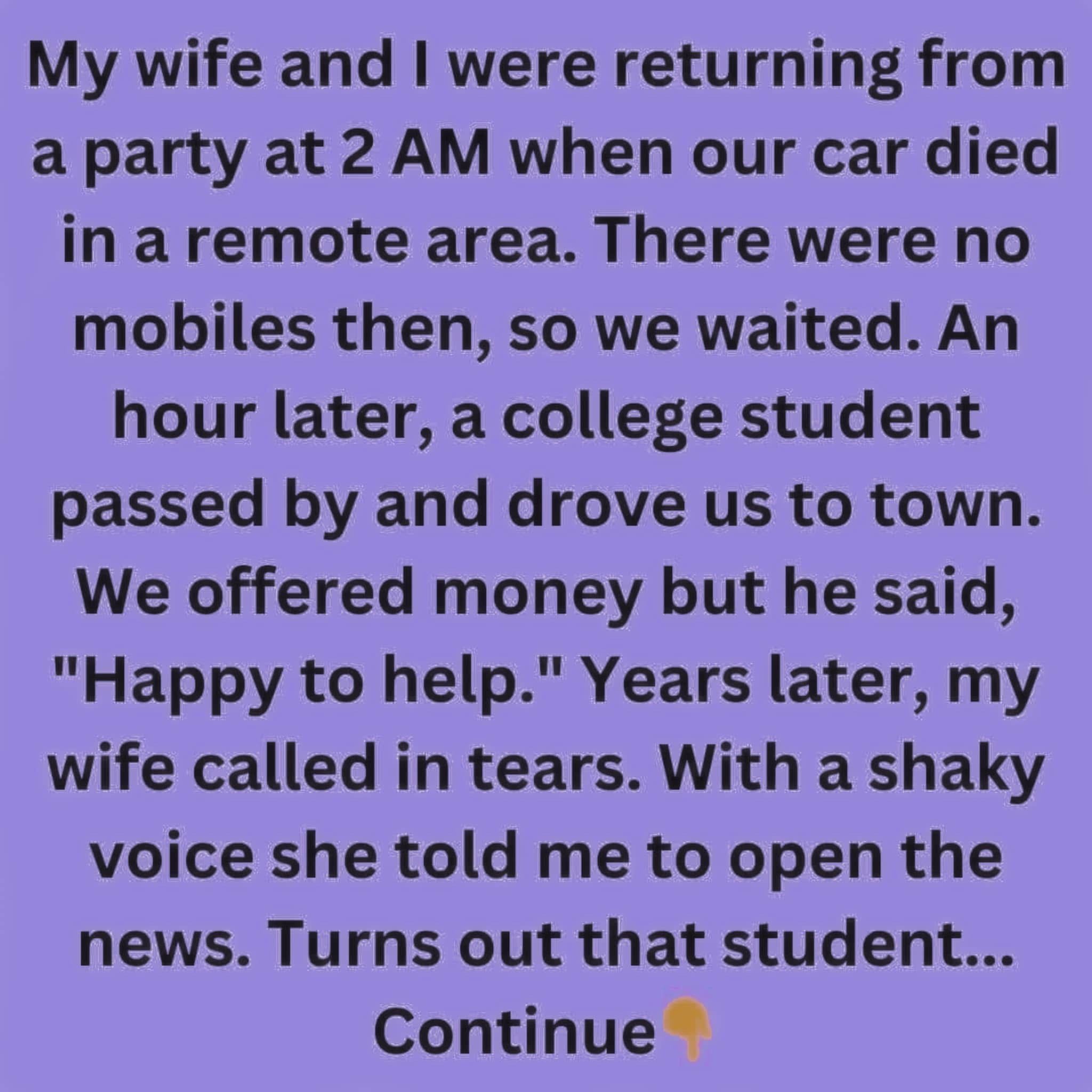 Years later, my wife called in tears. With a shaky voice she told me to open the news. Turns out that student was actually a 35-year-old man who had robbed over 30 people in forests and abandoned areas, targeting drivers late at night.