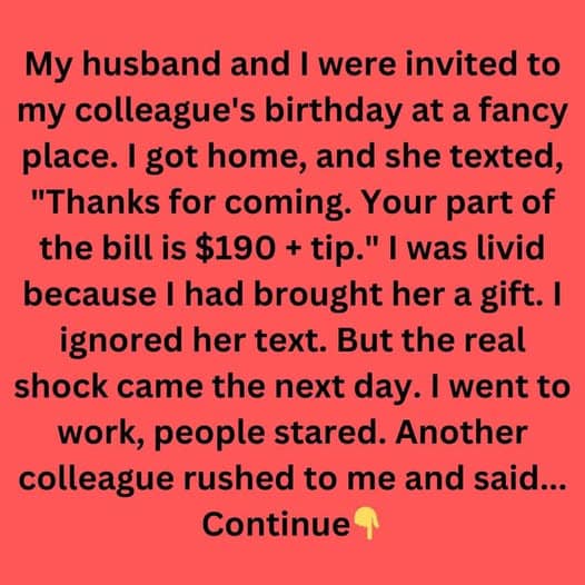 My husband and I were invited to my colleague’s birthday at a fancy place. I got home, and she texted me, “Thanks for coming. Your part of the bill is $190 + tip.” I was livid because I had brought her a nice gift. I ignored her text. Then, a few hours later, I decided to write to her, “I think I have already paid you with the nice gift I brought ;).”