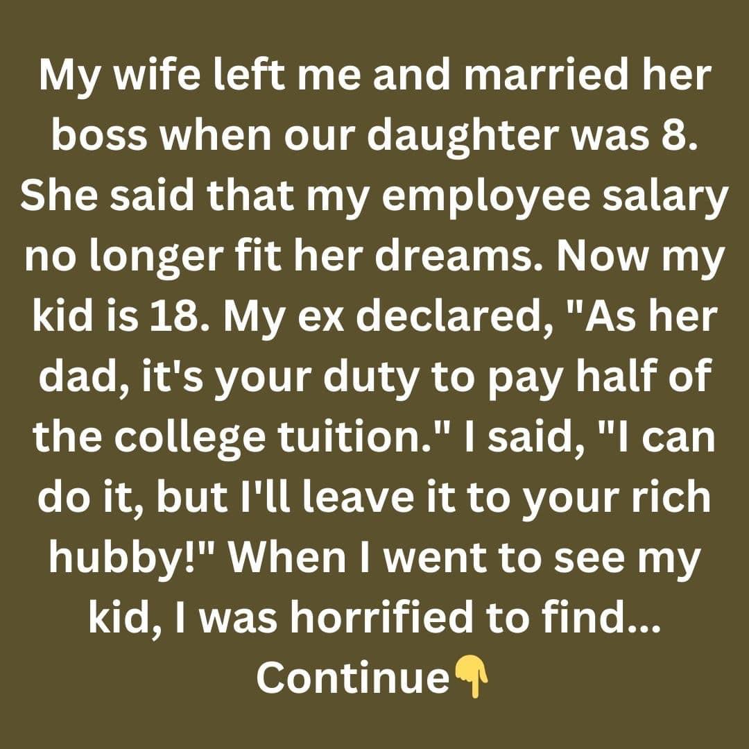 My wife left me when our daughter was 8 because my employee salary no longer fit her dreams. She married her boss. Now my kid is 18. My ex declared, “As her dad, it’s your duty to pay half of the college tuition.” I said, “I can do it, but I’ll leave it to your rich hubby!” In fact, I do have some money set aside, but I know that for my wife’s millionaire husband, paying the college tuition won’t even make a dent for him.