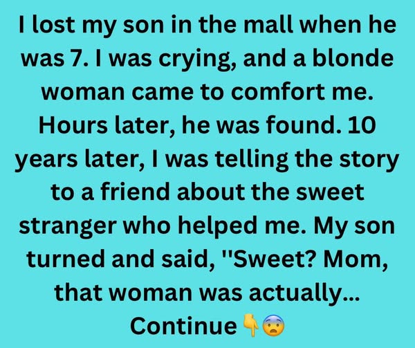 I lost my son in the mall when he was 7. I was crying, and a blonde woman came to comfort me. Hours later, he was found.10 years later, I was telling the story to a friend and mentioned the sweet stranger who helped me.