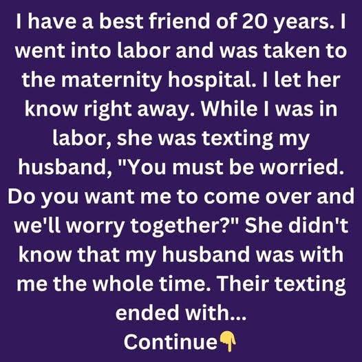 I have a best friend of 20 years. I went into labor and was taken to the maternity hospital. I let her know right away. While I was in labor, she was texting my husband, “Hi, you must be worried.