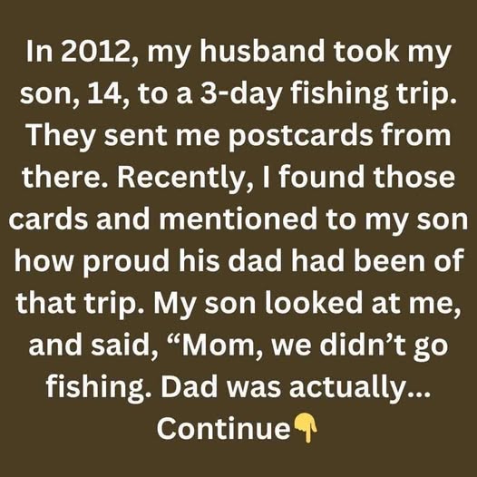 In 2012, my husband took my 14-year-old son on a 3-day fishing trip. They sent me postcards from there. Recently, I found those cards and mentioned to my son how proud his dad had been of that trip. My son looked at me and said, “Mom, we didn’t go fishing. Take a closer look at the postcards. Dad was actually looking for a place to move out. The fishing trip was just an excuse.”