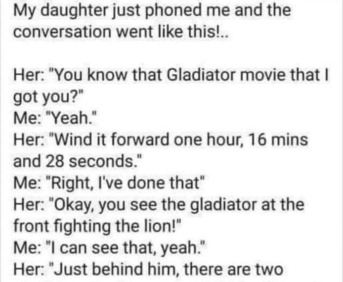 Her: “Okay, you see the gladiator at the front fighting the lion! “