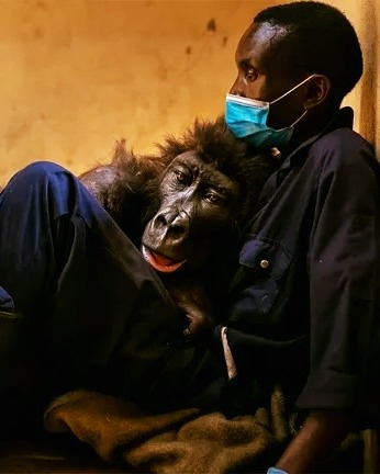 Knowing the baby gorilla was orphaned, they took her in, and ranger Andre Bauma formed an instant connection: “All night long, Andre held the baby close to him, keeping her tiny body tightly against his bare chest for warmth and comfort,” Virunga said in a news relase.