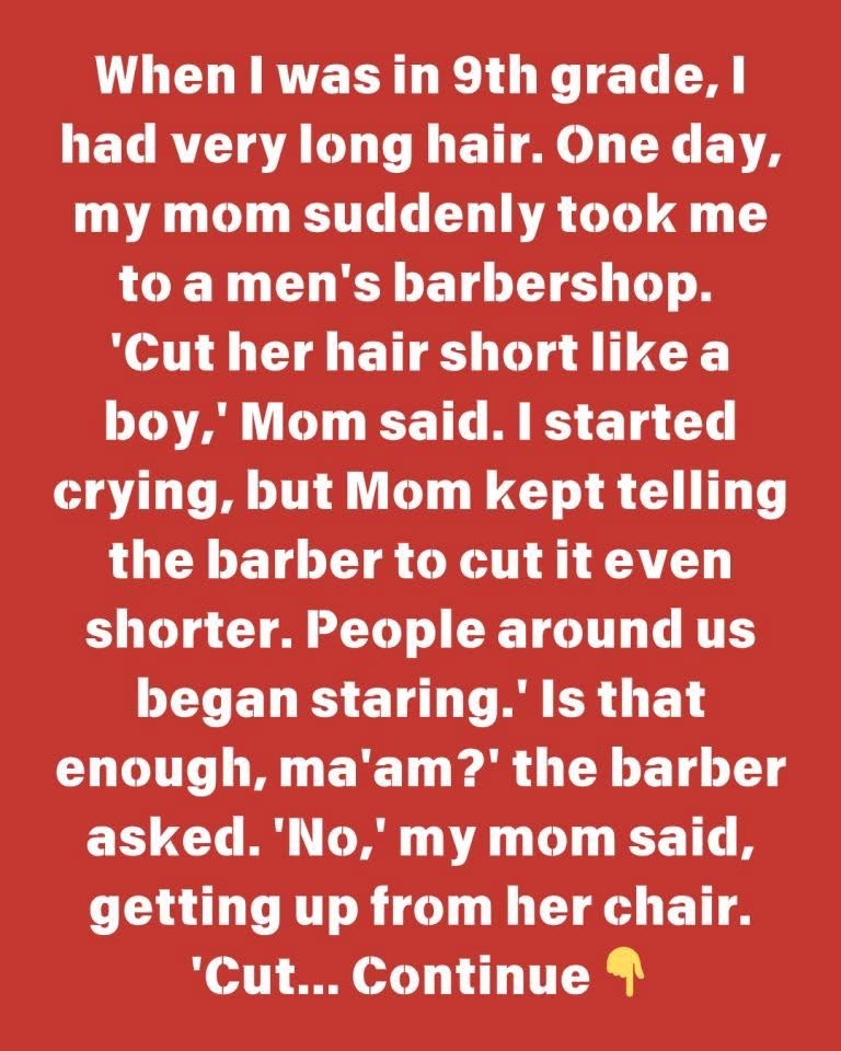 When I was in ninth school, I had quite long hair. One day, my mother unexpectedly took me to the barbershop. ‘Cut her hair short like a boy,’ Mom instructed. ‘Like a bob?’ the barber inquired. ‘No. Cut it above her ears. I wept, but Mom continued asking the barber to cut it short. People surrounding us began staring. ‘Is that everything, ma’am?’ the barber inquired. ‘No,’ my mother said, rising up. ‘Cut mine just like hers.’ My mother was preparing us for a mother-daughter Halloween party, and she wanted us both to get bowl cuts. We attended the celebration, and many people complemented our outfits. We even received the ‘Best Costume’ award. In the end, I suppose it was worthwhile, because I really miss my mother.
