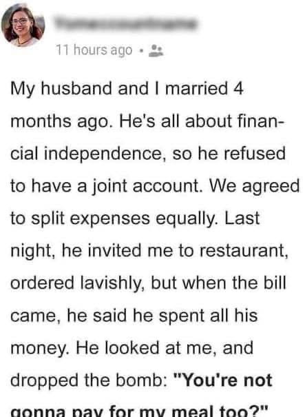 A woman shared on Reddit that after four months of marriage, she and her husband had agreed to keep finances separate and split expenses equally. However, her husband spent freely without considering their budget. When they dined out, she expected to pay for her own meal, but he ordered more food. He was shocked when she insisted on separate checks, claiming he couldn’t afford it. She reminded him of their agreement, and he later accused her of being mean. Redditors supported her, pointing out red flags in his behavior and advising the couple to address their issues, possibly through therapy.