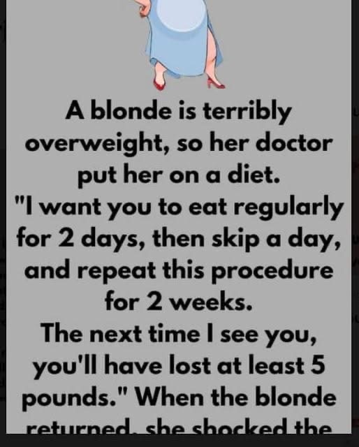 A blonde is terribly overweight, so her doctor put her on a diet. “I want you to eat regularly for 2 days, then skip a day, and repeat this procedure for 2 weeks. The next time I see you, you’ll have lost at least 5 pounds.”When the blonde returned, she shocked the doctor by losing nearly 20 pounds. “Why, that’s amazing!” the doctor said, “Did you follow my instructions? ”The blonde nodded… “I’ll tell you though, I thought I was going to drop dead that 3rd day. “From hunger, you mean?”, asked the doctor. “No, from skipping.”