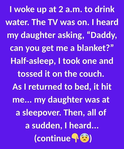 I woke up at 2 a.m. to drink water. The TV was on. I heard my daughter asking, “Daddy, can you get me a blanket?” Half-asleep, I took one and tossed it on the couch. As I returned to bed, it hit me… my daughter was at a sleepover.