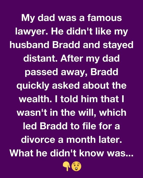 When Sarah married Bradd, a fellow student, her father warned her that Bradd was lazy and interested in their family’s fortune. After her father’s death, Bradd’s first concern was her inheritance, but Sarah revealed she wasn’t in the will since she was adopted. He soon filed for divorce, and Sarah discovered her father’s plan.