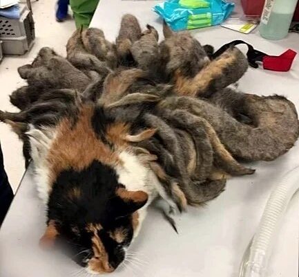 Hidey, a cat whose elderly owner had Alzheimer’s, suffered years of neglect and developed thick mats of fur resembling dreadlocks. Rescued by the Pittsburgh Animal Rescue League, she hadn’t been groomed in up to two years.