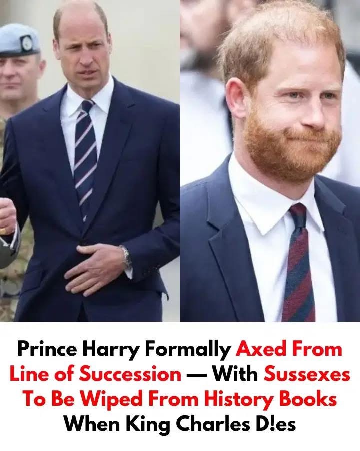 Prince Harry has reportedly been removed from the royal line of succession, with growing speculation that he and Meghan Markle may soon lose their titles. Sources claim Prince William plans to cut ties completely once he becomes king, aiming to erase the couple from the royal narrative. Quiet talks between palace aides and government officials are allegedly underway to begin the process.