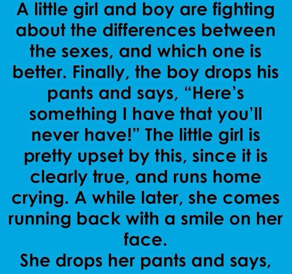 Finally, the boy drops his pants and says, “Here’s something I have that you’ll never have!”