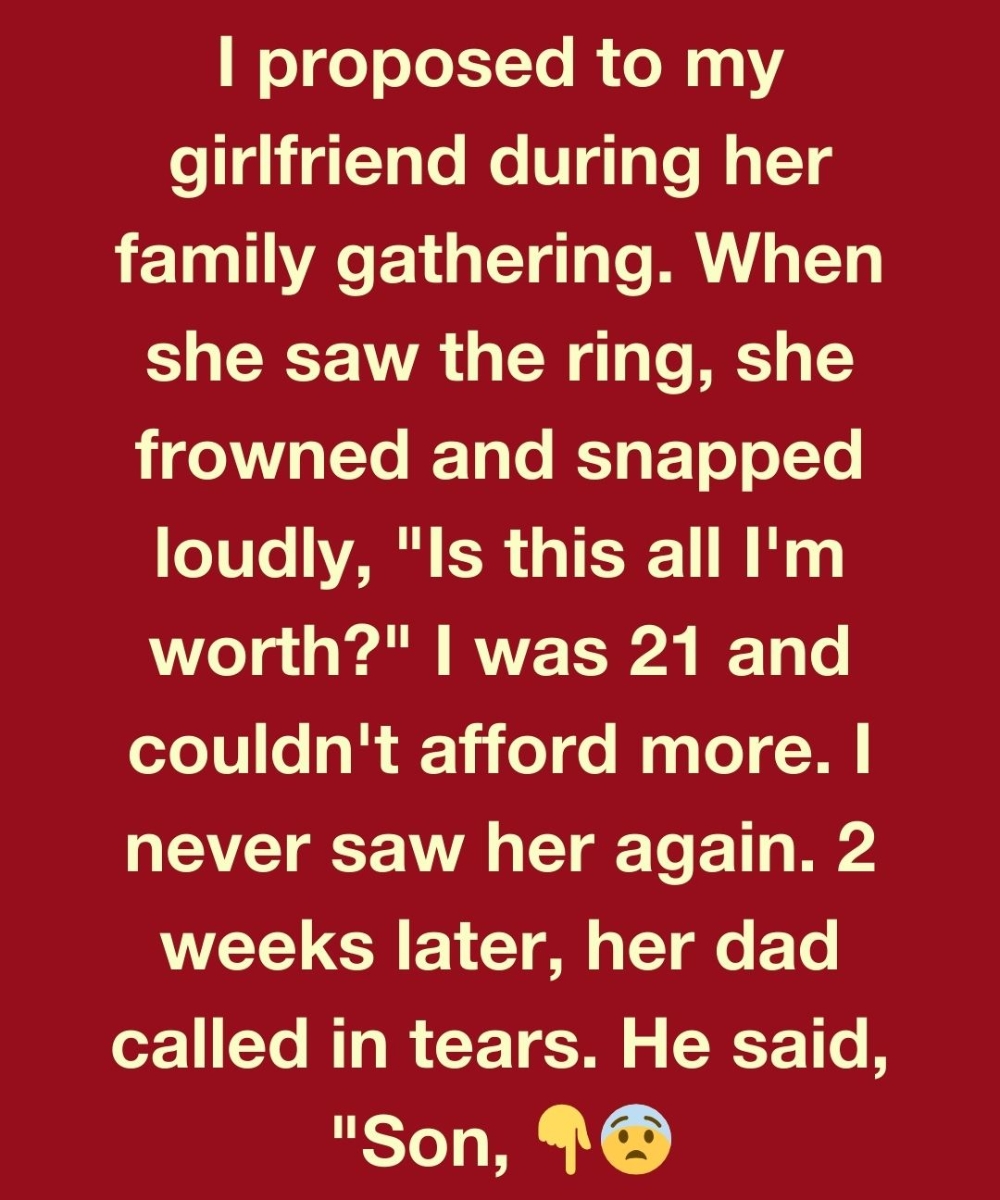 I proposed to my girlfriend, Becky, during her family gathering. When she saw the ring, she frowned and snapped loudly, “Is this all I’m worth?” I was 21 and couldn’t afford more. I never saw her again. I removed her from all my socials.