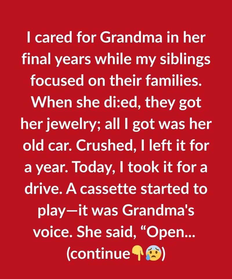 Suddenly, Grandma’s voice filled the car, clear and strong as I remembered it from her healthier days. “Hello, my dear Sara,” she said, and I nearly had to pull over from the shock of hearing her again. “If you’re listening to this, then I’m gone, and you’re probably feeling confused about why I left you that old car.”