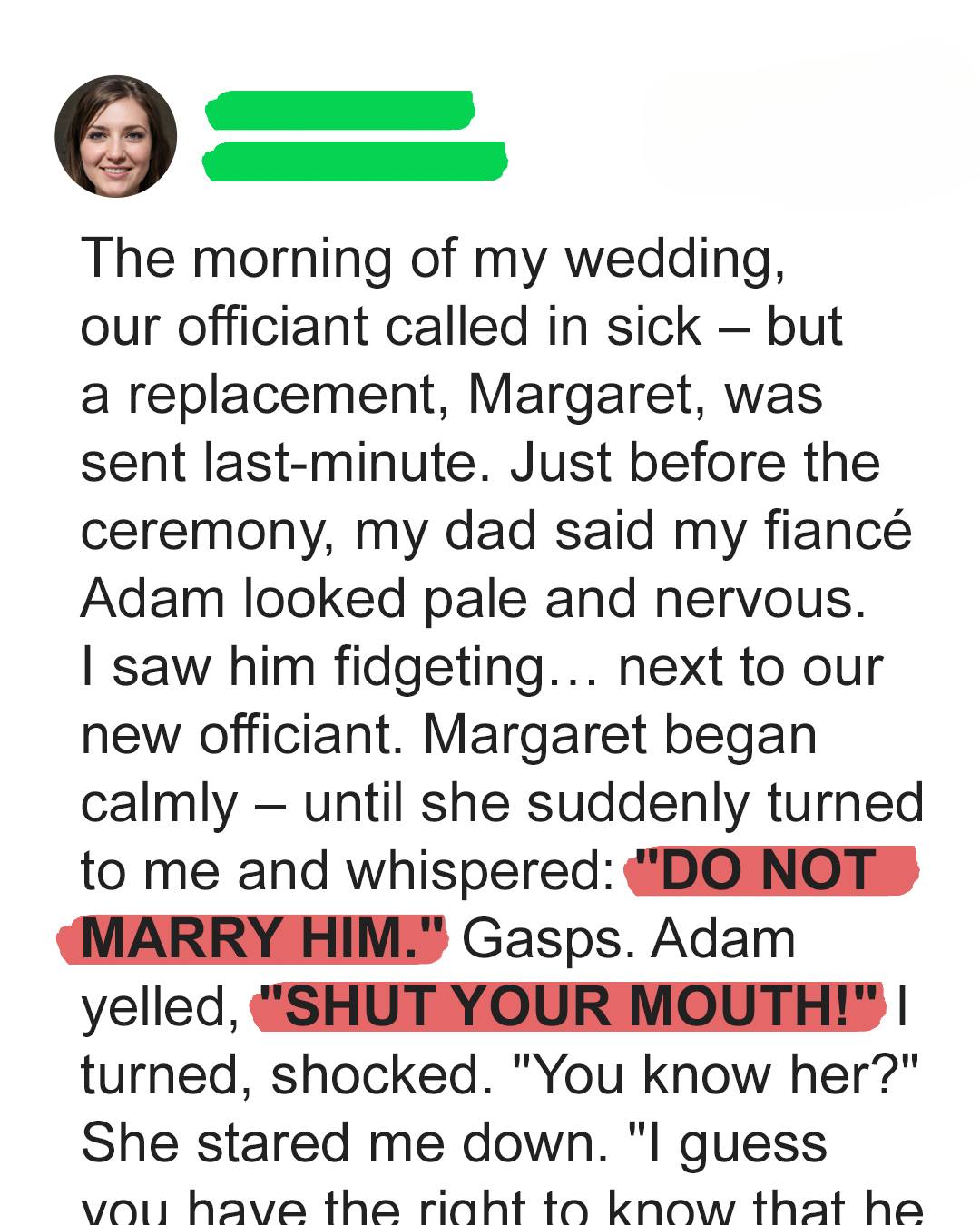 What was meant to be the happiest day of my life turned into a moment of shocking truth that saved me from a future I never saw coming. My fiancé, Adam, and I had spent over a year planning a sweet, intimate wedding. Everything was set—until our officiant fell ill at the last minute and a replacement, Margaret, stepped in. I thought we were lucky to find someone on such short notice. I had no idea this woman wasn’t just filling in—she was there for a reason.