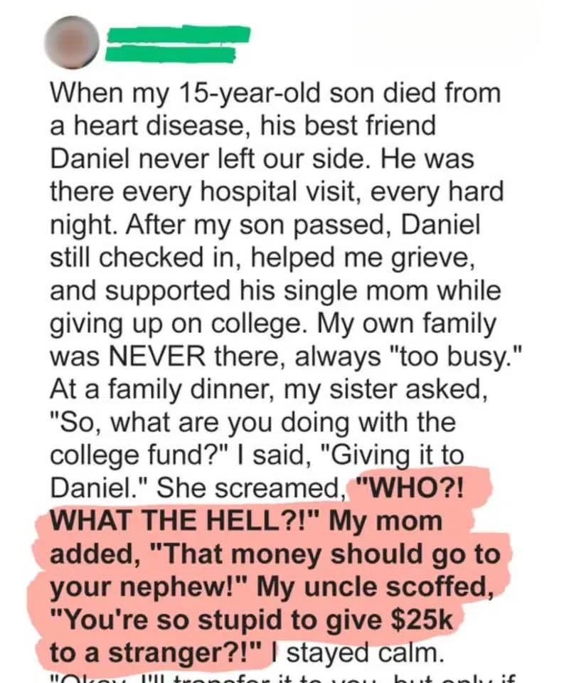 “That boy from the hospital?” Mom asked. “Sweetheart, that money should stay in the family.”