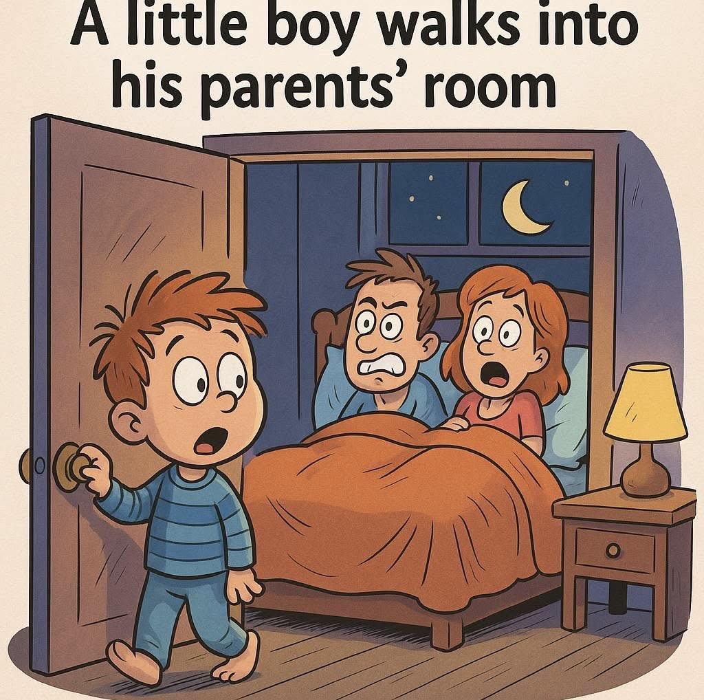 A little boy walks into his parent’s room to see his mom on top of his dad bouncing up and down.