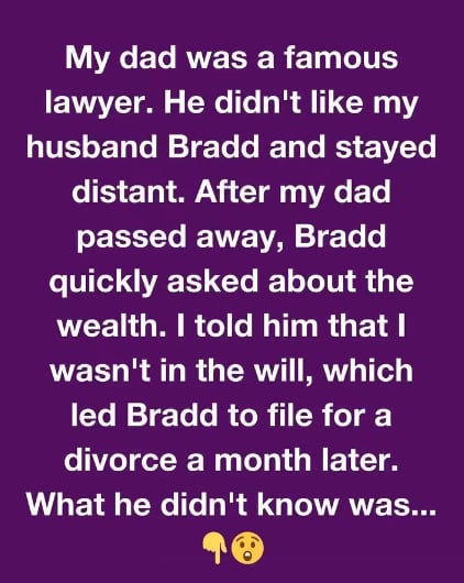At the dinner, Sarah’s father’s partner revealed her father’s will to Bradd. It contained a stipulation indicating that if Bradd remained married to Sarah for five years after her father passed away, he would be entitled to half of the inheritance, while Sarah would receive the other half. However, in the case of a divorce, Sarah was named as the only beneficiary of her father’s entire fortune and assets.