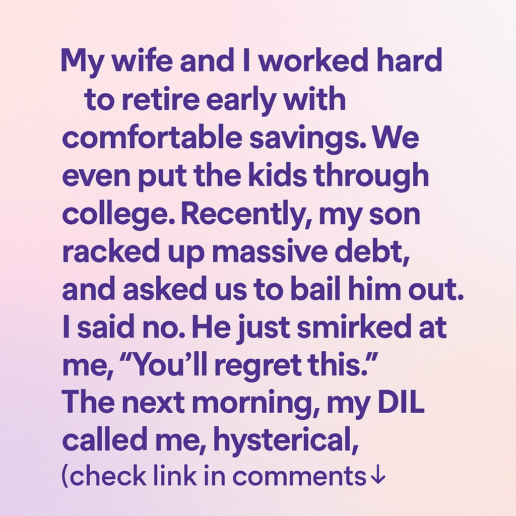 My wife and I worked hard for decades so we could retire early with enough savings to live comfortably. We were proud that we managed to put our kids through college and still set aside a nest egg for the future. Life finally felt steady. Then came the call from our son. He admitted he had racked up massive debt through poor choices and wanted us to bail him out. When I told him no, his face darkened, and he smirked: “You’ll regret this.”